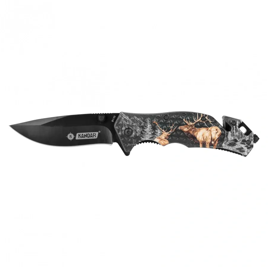 Kandar N379 je skladací edc nôž, vybavený čepeľou z nehrdzavejúcej ocele 440, profilovanými plastovými obloženiami, čepeľou na rezanie bezpečnostných pásov a núdzovým rozbíjačom skla.